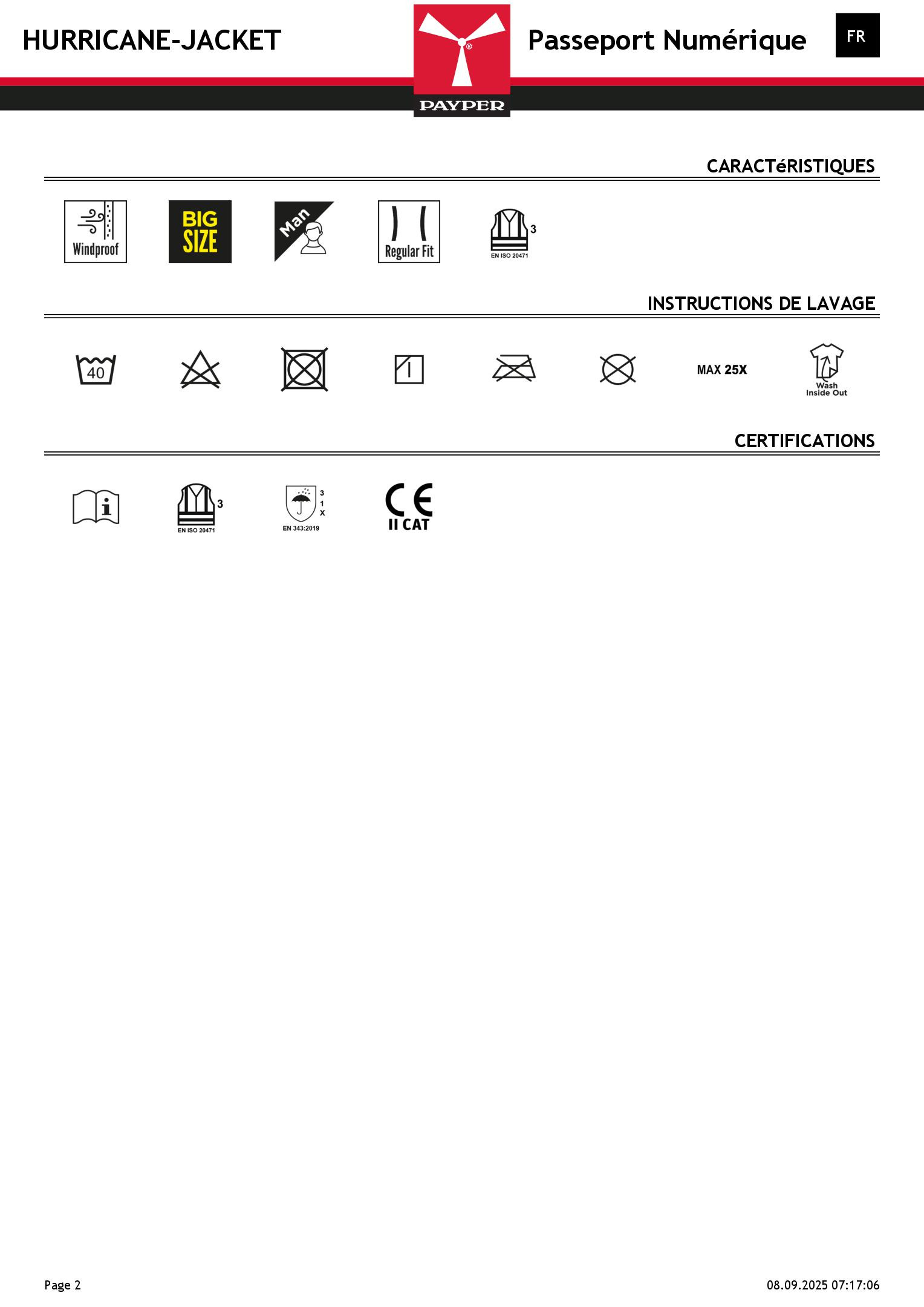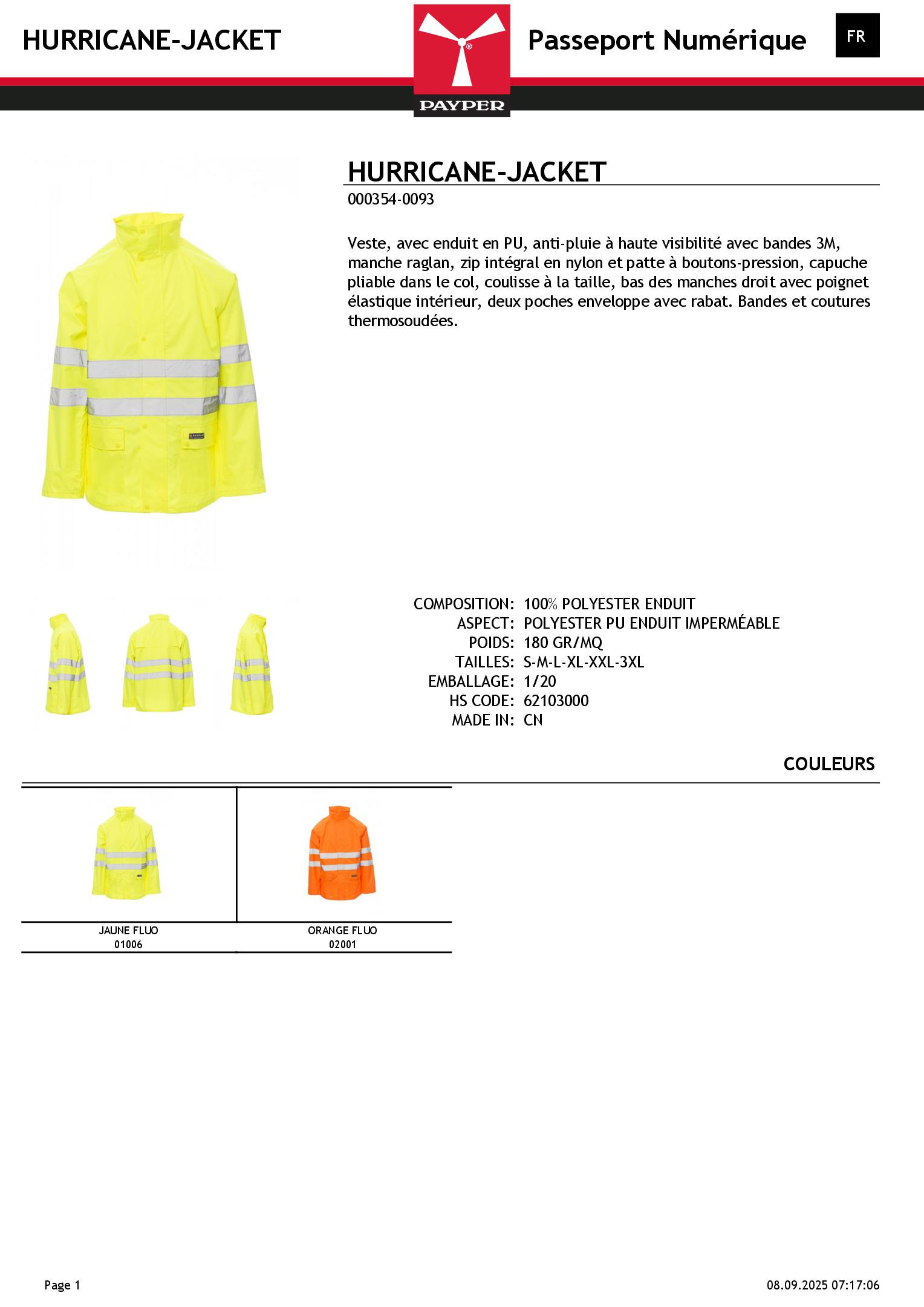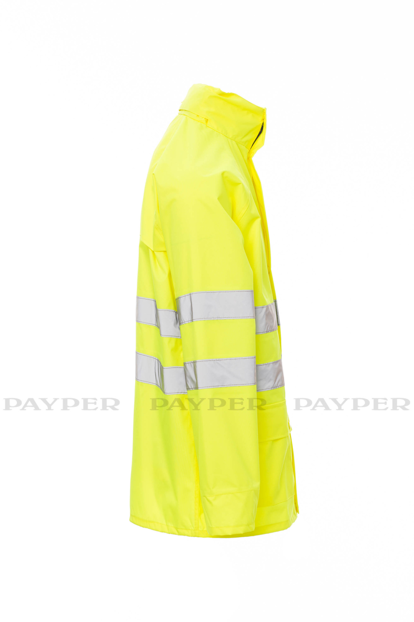Veste, avec enduit en PU, anti-pluie à haute visibilité avec bandes 3M, manche raglan, zip intégral en nylon et patte à boutons-pression, capuche pliable dans le col, coulisse à la taille, bas des manches droit avec poignet élastique intérieur, deux poches enveloppe avec rabat. Bandes et coutures thermosoudées.