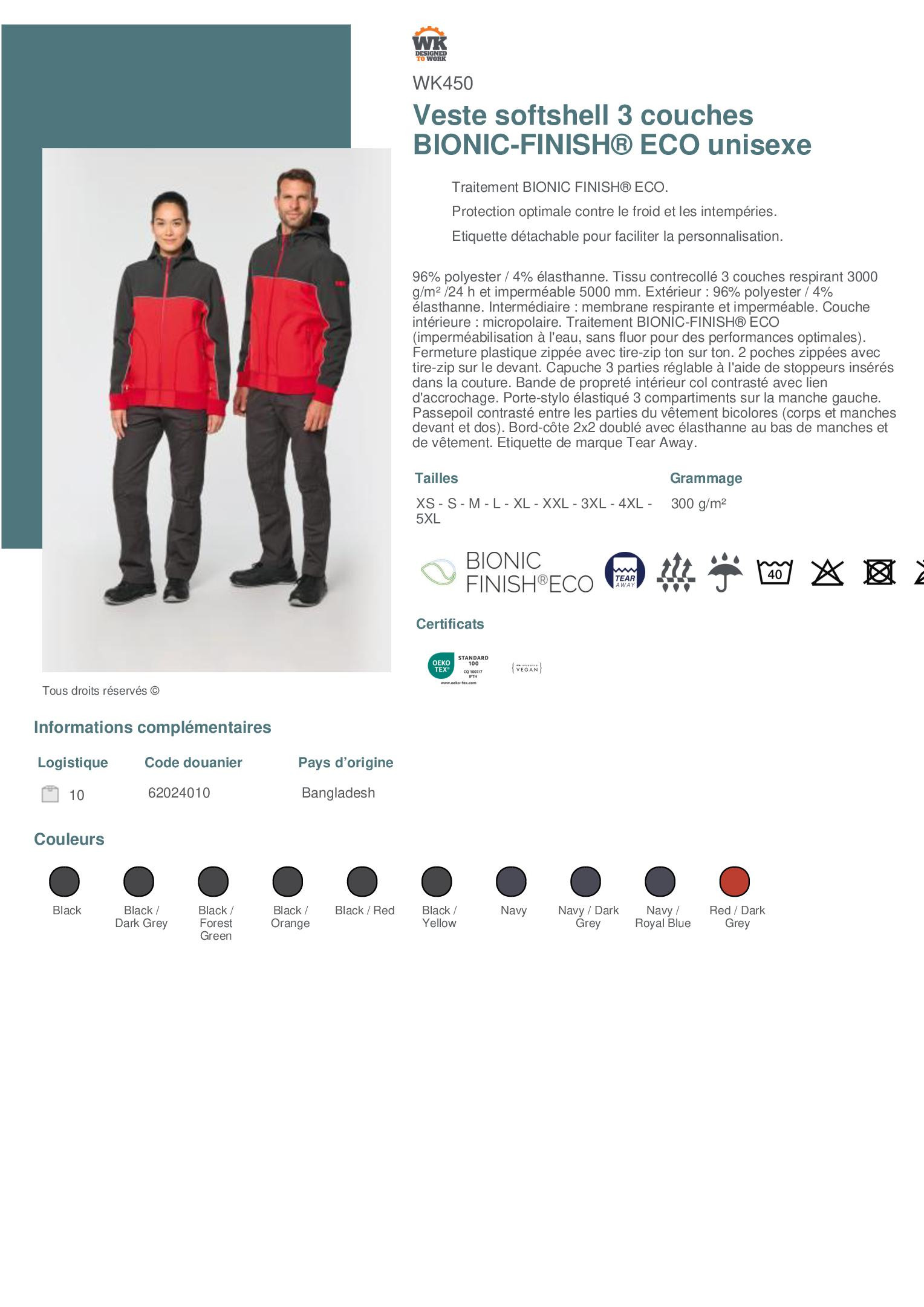 96% polyester / 4% élasthanne. Tissu contrecollé 3 couches respirant 3000 g/m² /24 h et imperméable 5000 mm. Extérieur : 96% polyester / 4% élasthanne. Intermédiaire : membrane respirante et imperméable. Couche intérieure : micropolaire. Traitement BIONIC-FINISH® ECO (imperméabilisation à l'eau, sans fluor pour des performances optimales). Fermeture plastique zippée avec tire-zip ton sur ton. 2 poches zippées avec tire-zip sur le devant. Capuche 3 parties réglable à l'aide de stoppeurs insérés dans la couture. Bande de propreté intérieur col contrasté avec lien d'accrochage. Porte-stylo élastiqué 3 compartiments sur la manche gauche. Passepoil contrasté entre les parties du vêtement bicolores (corps et manches devant et dos). Bord-côte 2x2 doublé avec élasthanne au bas de manches et de vêtement. Etiquette de marque Tear Away.