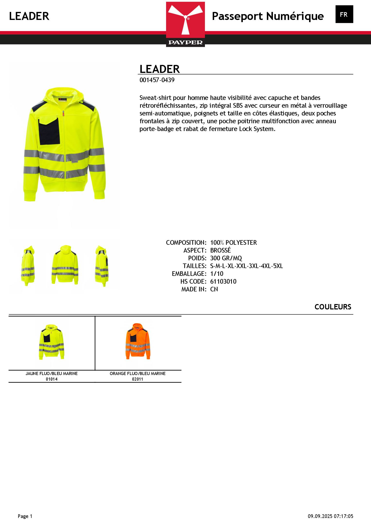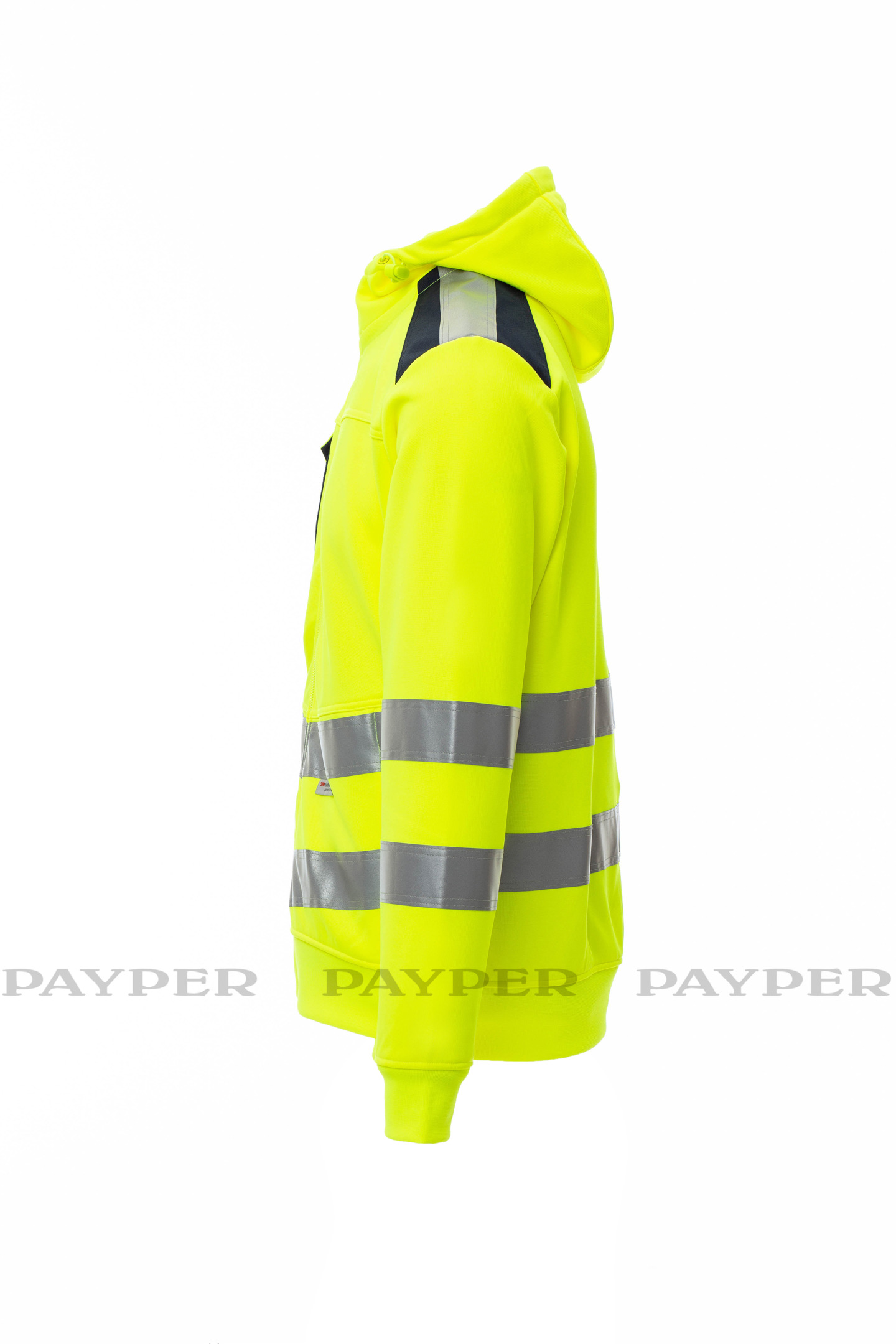Sweat-shirt pour homme haute visibilité avec capuche et passepoils réfléchissants, zip SBS avec curseur en métal « autolock », poignets et taille en côtes élastiques, deux poches frontales à zip couvert, une poche poitrine multifonction avec anneau porte-badge et rabat de fermeture LOCK SYSTEM.